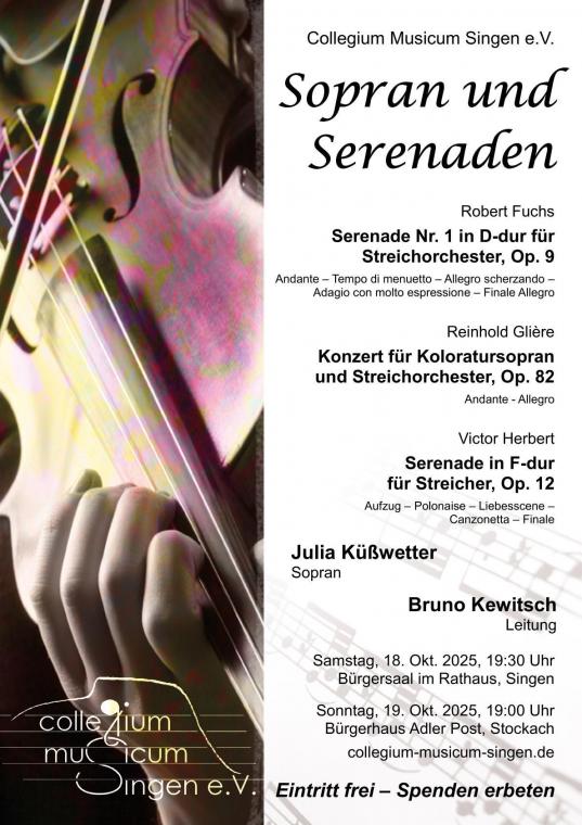Spielen Sie ein Streichinstrument und haben Sie Interesse, bei Collegium Musicum mitzuspielen? Wir freuen uns sehr, wenn Sie uns verstärken würden. Wir proben regelmäßig während der Schulzeit in der Jugendmusikschule Singen auf der Musikinsel montags von 19.45 Uhr bis 21.30 Uhr.
